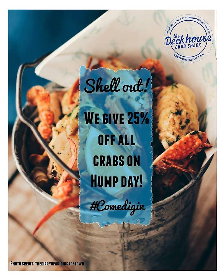 Our favourite crab shack in Cape Town – The Deckhouse – is slashing their prices every Wednesday evening to celebrate hump day giving you a whopping 25% discount on all crabs. Come an dig in to taste some of the best seafood in Cape Town!