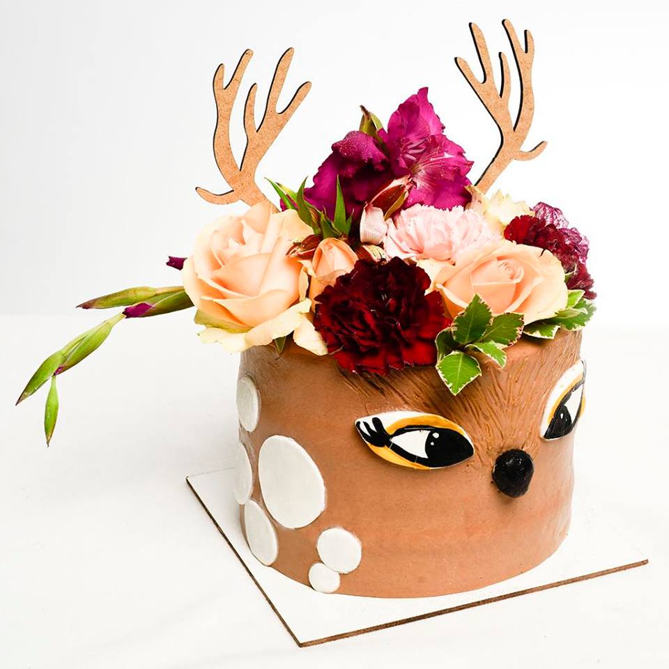 This year, Christmas comes perfectly wrapped in the form of a REINDEER CAKE. This little guy is a festive sensation. Featuring 3 layers of moist chocolate cake filled with cream cheese mocha frosting, beautifully decorated with a selection of flowers and reindeer horns, eyes and nose.