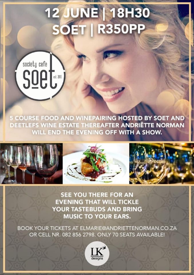 Soet Society café, in association with Andrietta Norman and Deetlefts Wine Estate are hosting yet another wine, dine, & music evening and they want you to be a part of it!