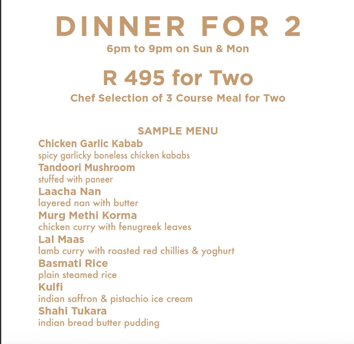 Enjoy a 3-Course dinner for two for only R495, available every Sunday and Monday!