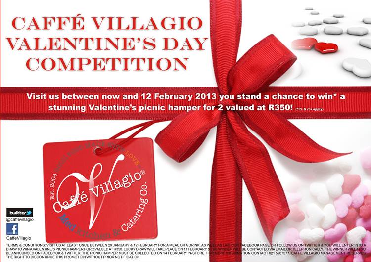 Visit Caffe Villagio once between the 30 January 2013 and 12 February 2013 for a meal or a drink as well as like their Facebook Page and/or follow them on Twitter; you will automatically enter into a draw to win a Valentine’s Picnic Hamper for 2 valued at R350. The draw will take place on the 13 February 2013 and the winner will be contacted with e-mail or by phone. and will also be announced on Facebook and Twitter. If you happen to be the lucky winner, you will have to collect the Picnic Hamper on the 14 February in-store.