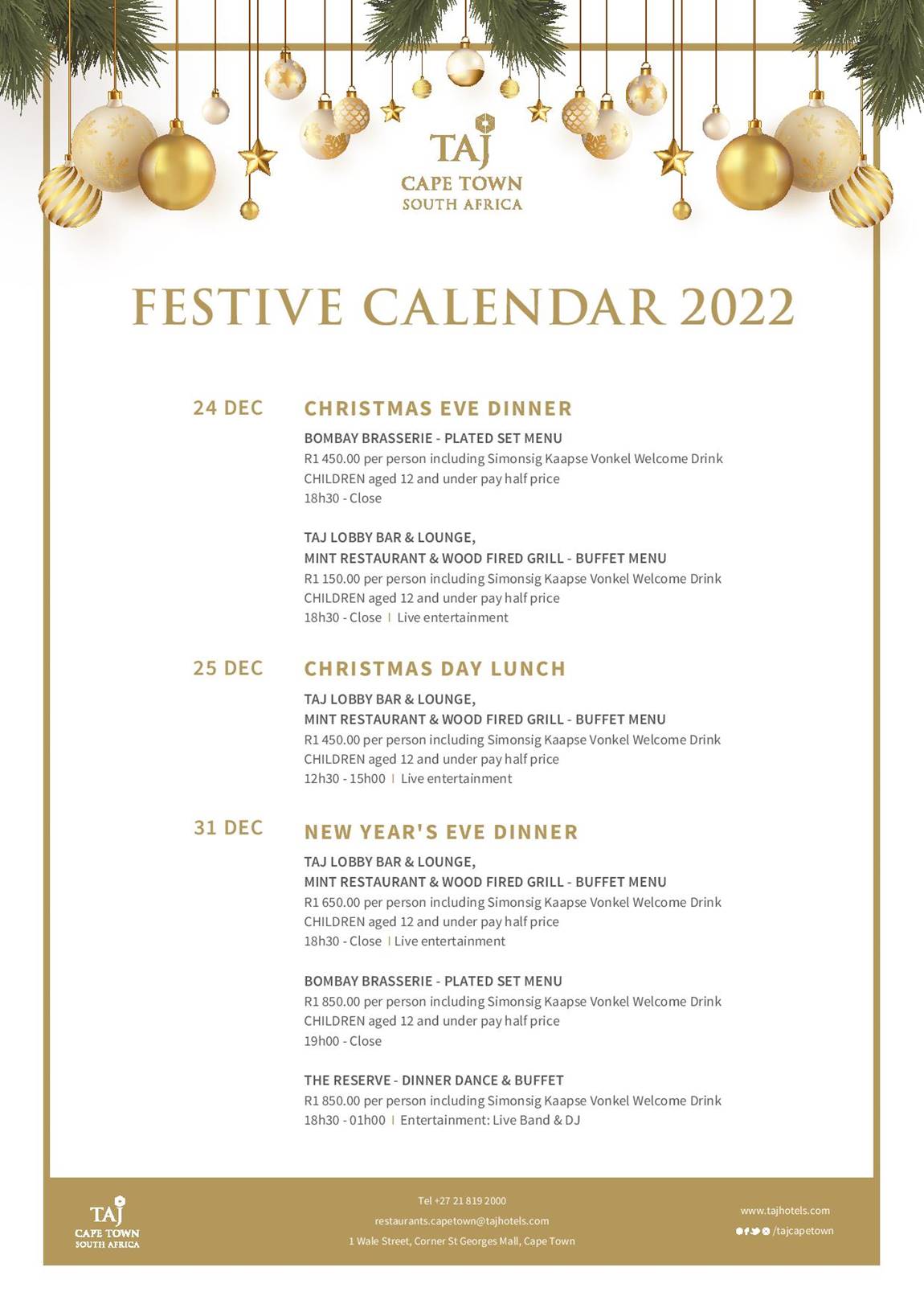 - Book your spot at The Reserve’s dinner dance and buffet now by contacting them at restaurants.capetown@tajhotels.com or +27 21 819 2000.
