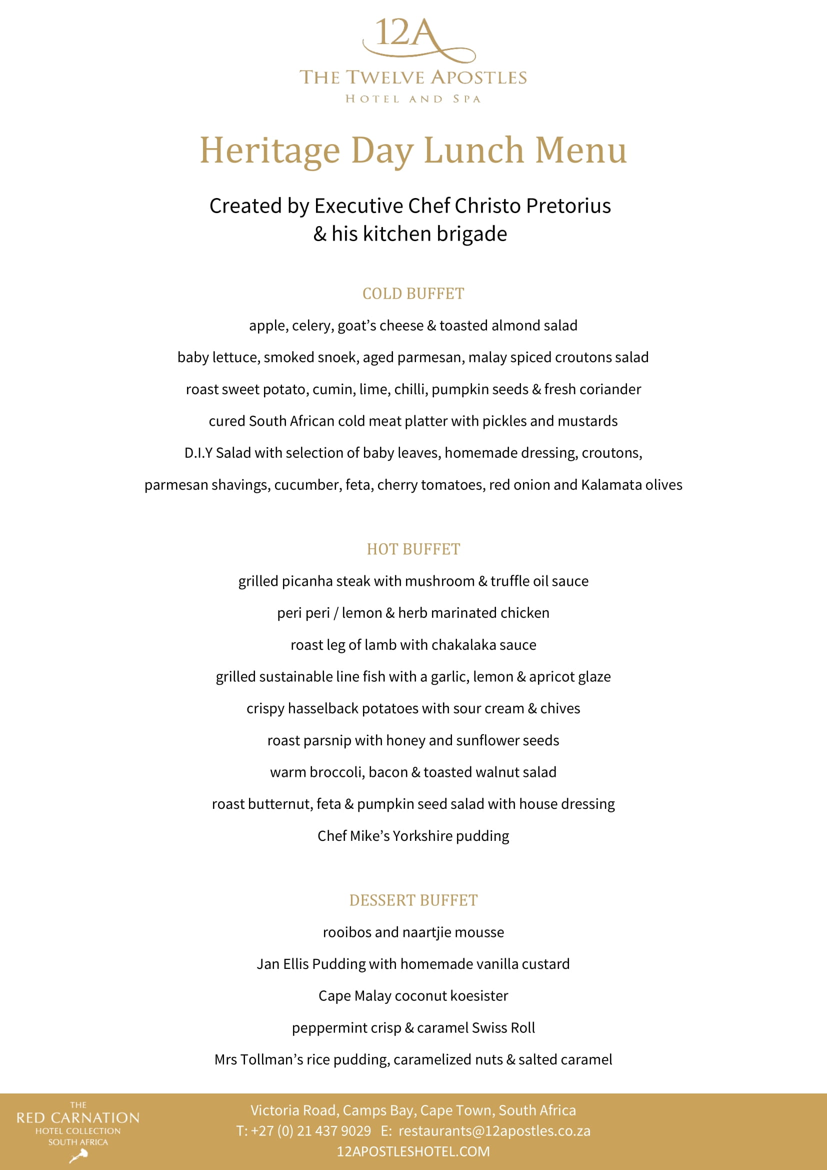Spend your afternoon at The Apostles Grill for a uniquely South African Experience. On this Heritage Day; Chef Christo Pretorius, promises a delicious 3-course buffet. Matched with the incredible views from the 12 Apostles. You are in for a treat!