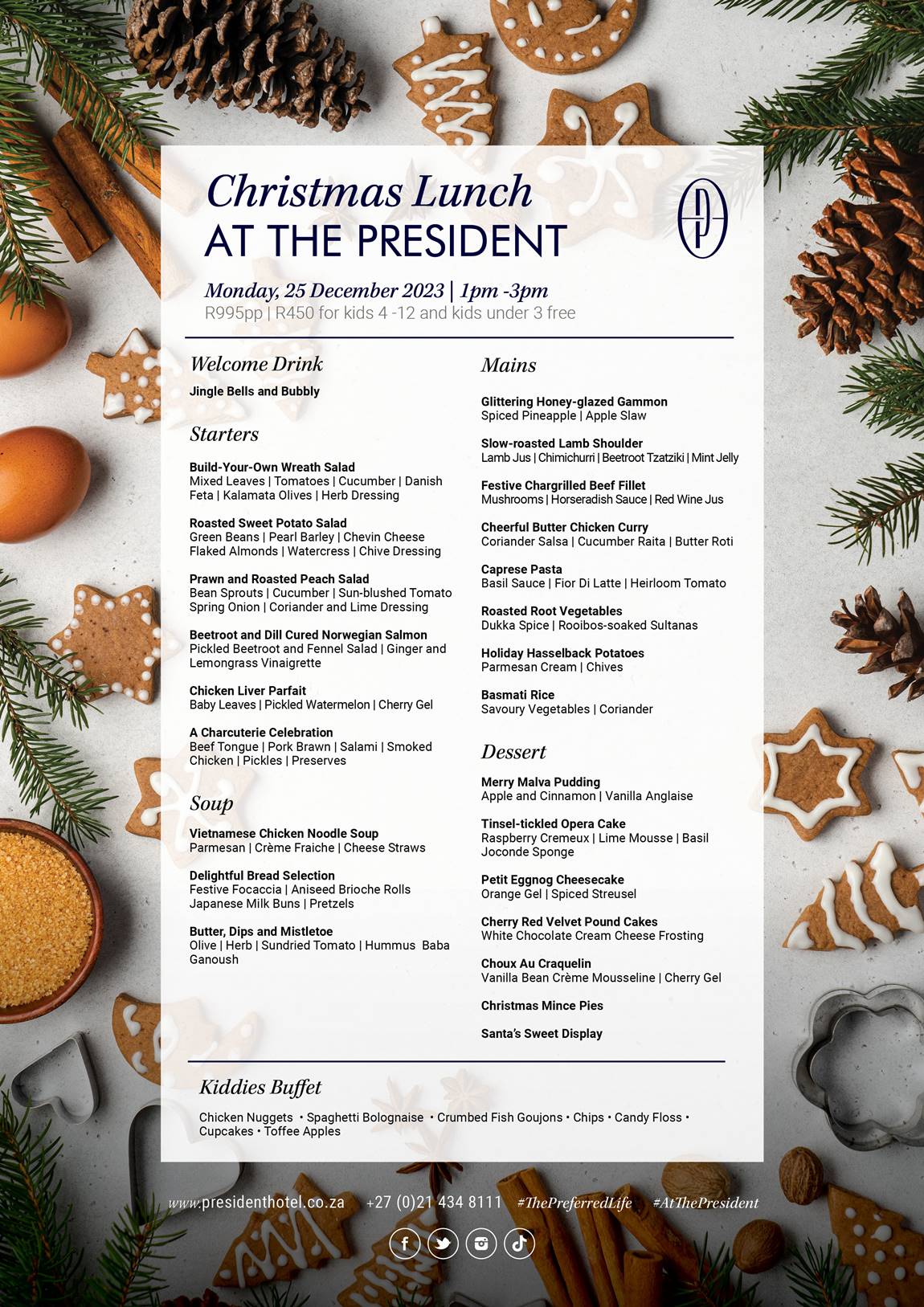 Kicking off at 1 pm on the 25th of December 2023, The President Hotel invites you to savor a Christmas feast like no other.