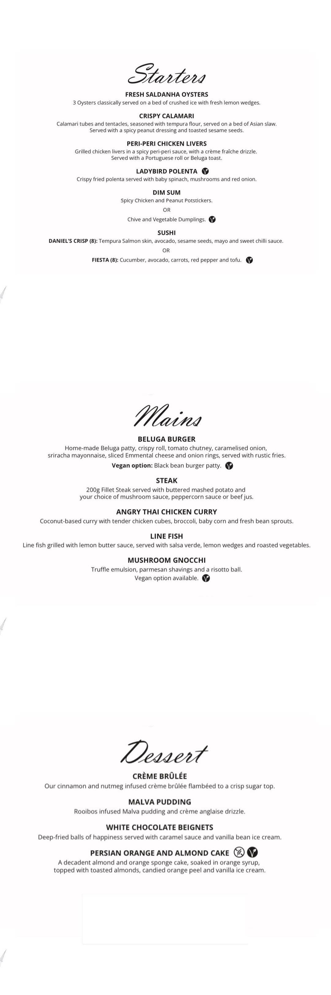 - For only R250, delight in a delectable 2-course meal, or elevate your dining experience with a sumptuous 3-course feast for R300. Available from Monday to Thursday between 11:00 and 22:00, the Winter Set Menu offers two enticing options to satisfy your cravings.