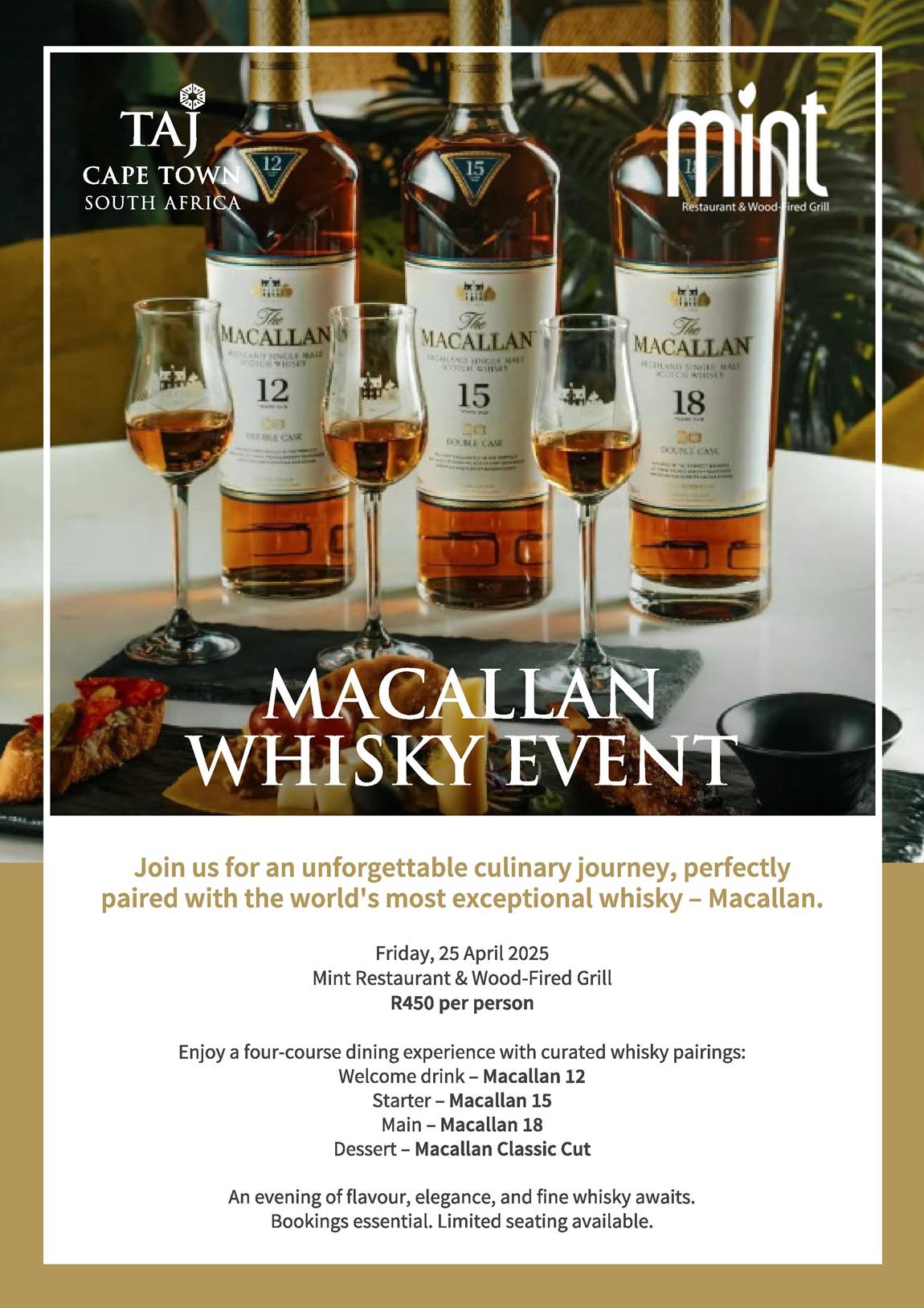 In a distinguished partnership with The Macallan — the globally celebrated icon of single malt Scotch whisky — The Mint Restaurant & Wood-Fired Grill at Taj Cape Town invites you to an exclusive four-course whisky pairing dinner, designed to captivate the senses and honour the legacy of fine craftsmanship.