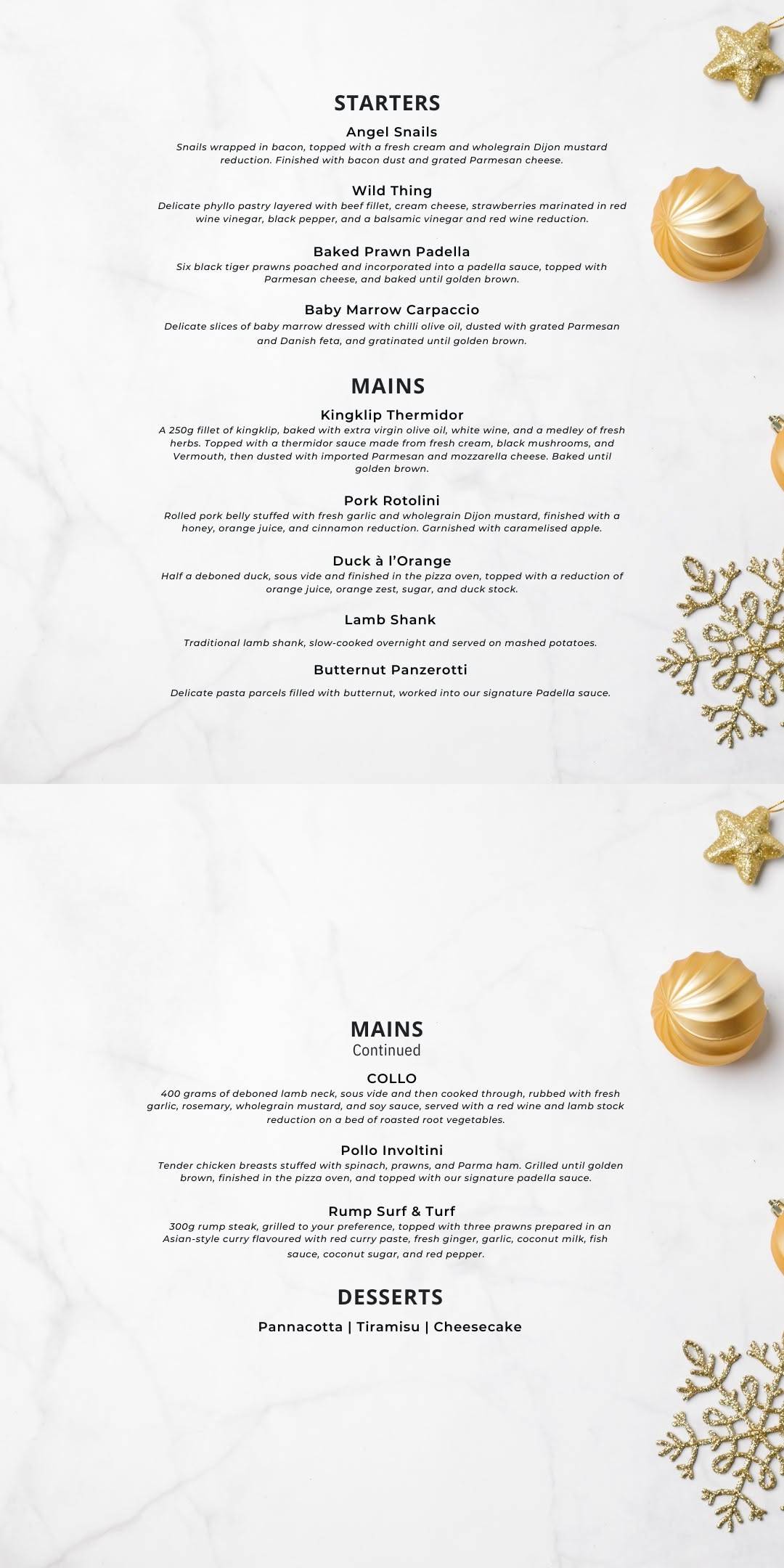 - The Christmas Day Lunch starts with a selection of starters that are as creative as they are delicious. The Angel Snails, bacon-wrapped snails served with a fresh cream and wholegrain Dijon mustard reduction, topped with crispy bacon dust and Parmesan, are a standout. For those with a taste for the unique, the Wild Thing layers delicate phyllo pastry with tender beef fillet, cream cheese, and strawberries marinated in red wine vinegar. Seafood lovers can savor the Baked Prawn Padella, featuring black tiger prawns baked with Parmesan and a rich Padella sauce. A vegetarian option, Baby Marrow Carpaccio, completes the starters with slices of baby marrow, feta, and a hint of chili oil.
