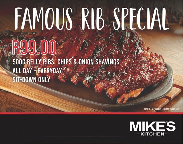 Bring the whole family to Mike’s Kitchen and enjoy their delicious Rib Special, for ONLY R99.00!