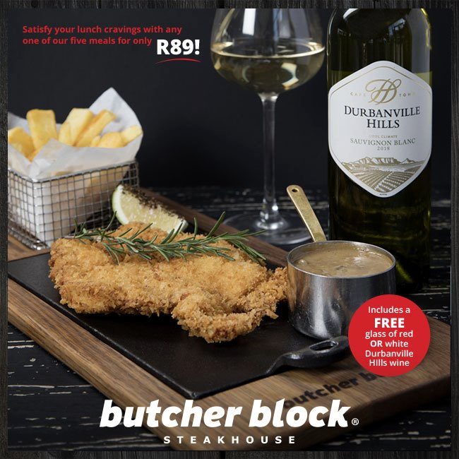 Choose one of five meals and a glass of either red or white Durbanville Hills wine for only R89 at Butcher Block.