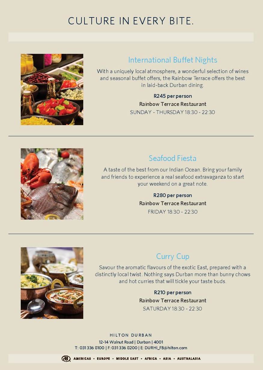 A taste of the best from our Indian Ocean. Bring your family and friends to experience a real seafood extravaganza to start your weekend on a great note every Friday evening when joining The Rainbow Terrace at the Hilton Durban. The menu is available for R280 per person.