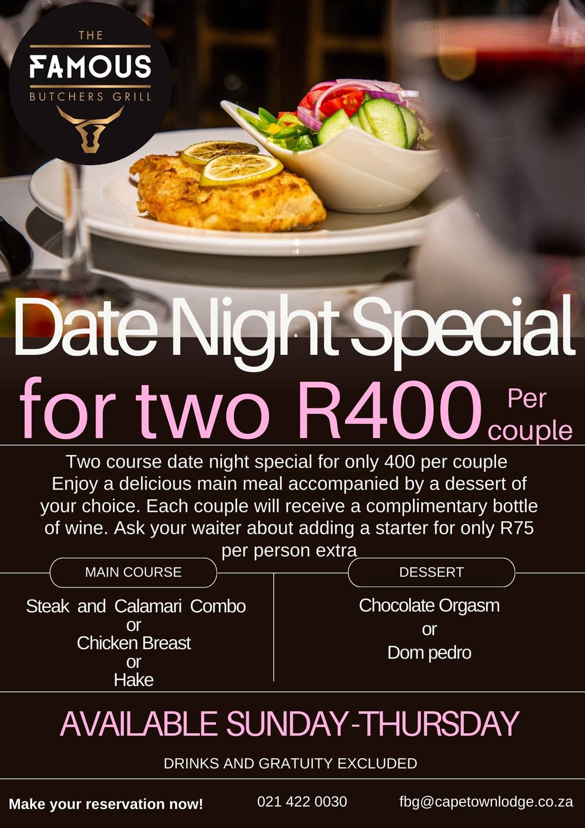 Reservations are recommended to secure a spot for this popular promotion. To make a reservation, call 021 422 0030 or email fbg@capetownlodge.co.za.