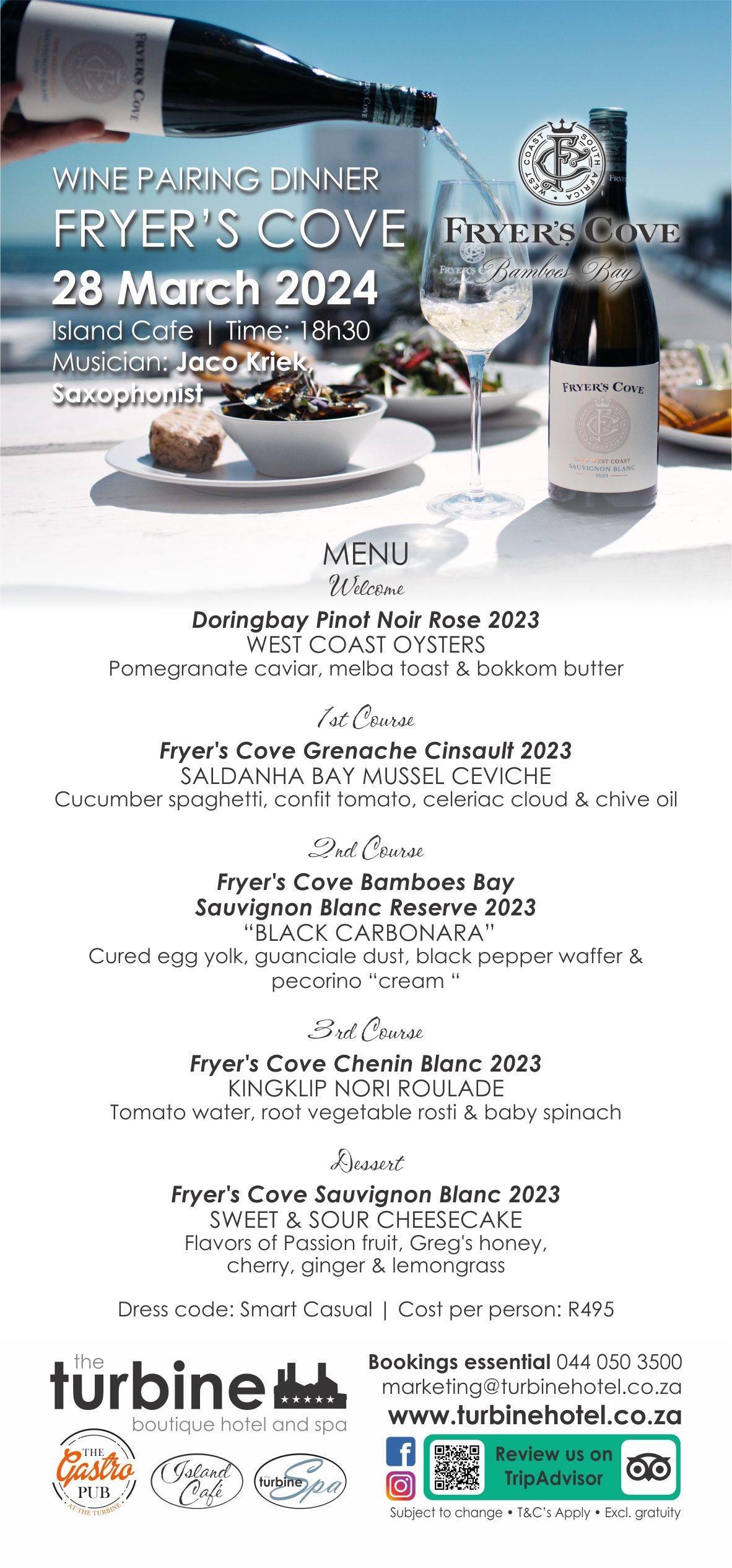 Immerse yourself in a symphony of flavors in Knysna at The Turbine Hotel’s highly anticipated Wine Pairing Dinner featuring Fryer’s Cove Wines.