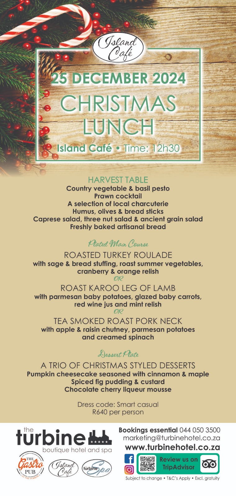 - For the main course, choose from three expertly prepared dishes: a traditional roasted turkey roulade with sage and bread stuffing, roast Karoo leg of lamb with parmesan baby potatoes, or tea-smoked roast pork neck complemented by creamed spinach and an apple-raisin chutney.
