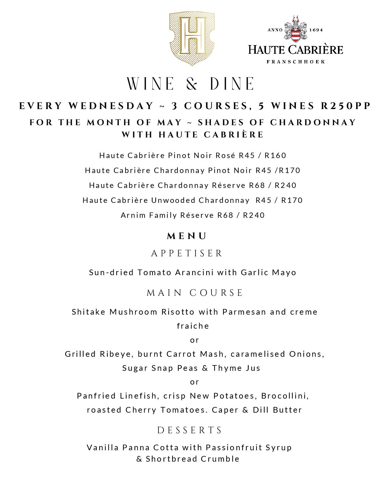 For just R250, guests will enjoy a three-course wine dinner every Wednesday evening that includes an aperitivo glass of wine on arrival, an appetizer, a main dish selection, a glass of wine of their choice from Haute Cabriere Shades of Chardonnay wines, and a petit four dessert.
