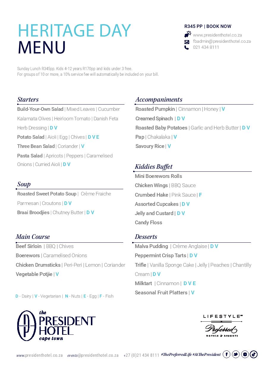 The Heritage Day Braai Feast at The President Hotel is available on Sunday, 24 September, between 1 pm and 3 pm. Priced at R345 per person (with special rates for children), this celebration is not to be missed.