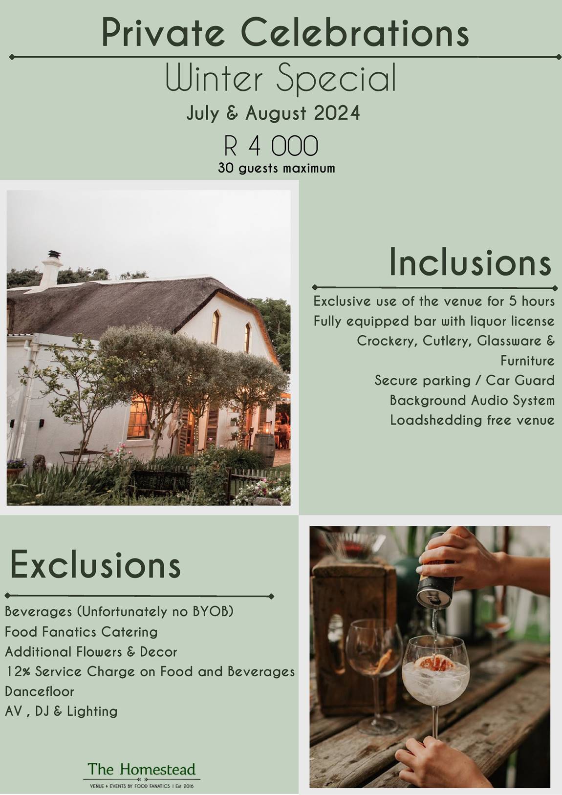 Food Fanatics at their The Homestead venue is offering an unbeatable Winter Special for private celebrations in July and August 2024.