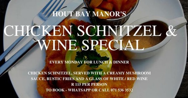 This offer is available on MONDAYS for lunch or dinner. Normal schnitzel price R130 (excluding wine). To book, WhatsApp or call 071 536 3532.