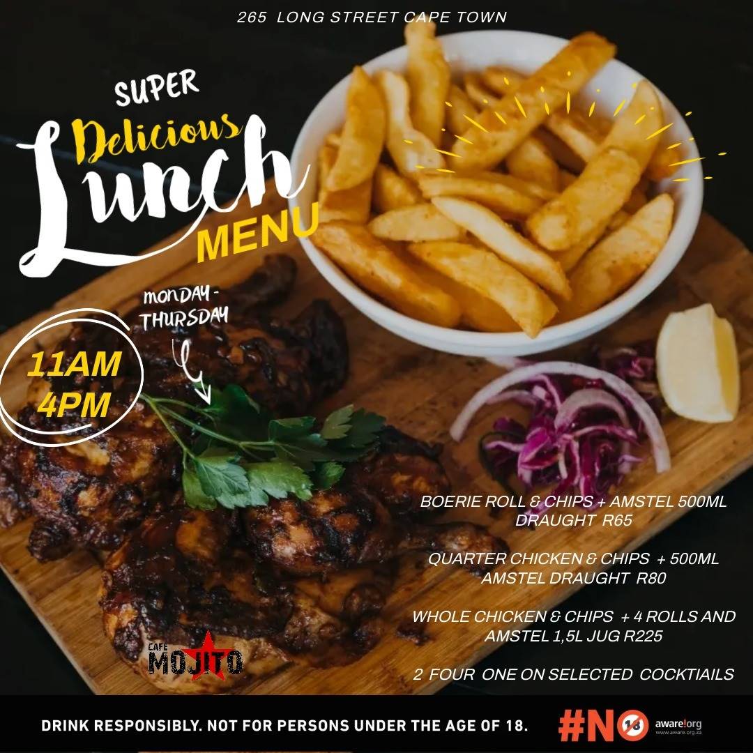 - Quarter chicken and chips with 500ml Amstel Draught – R80