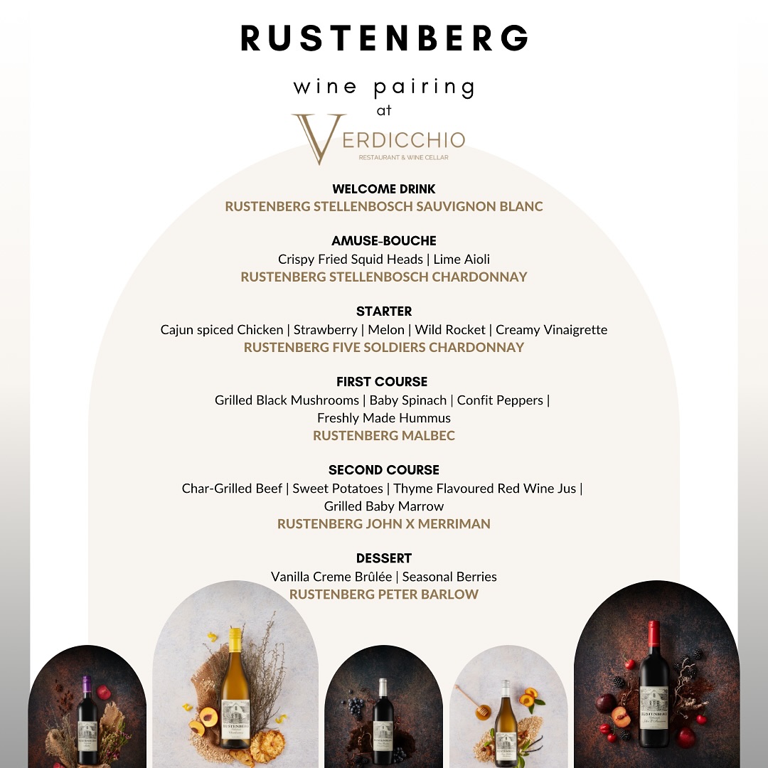- The evening kicks off with a welcome drink featuring Rustenberg Stellenbosch Sauvignon Blanc, setting the tone for a night of exceptional flavors.