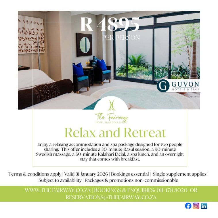 Bookings are essential, and availability is limited, so plan ahead for this unforgettable experience. Escape the everyday and treat yourself to a world of relaxation at The Fairway Hotel. Visit www.thefairway.co.za to book your Relax & Retreat package and immerse yourself in luxury.