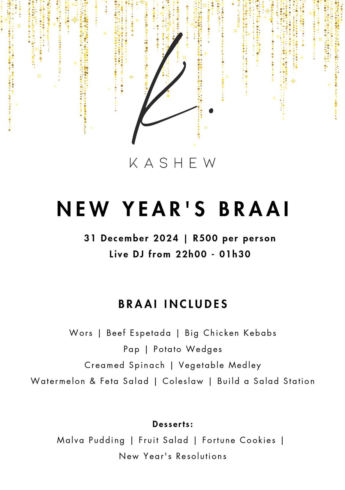 Kashew Restaurant is bringing in 2025 with a classic South African braai, paired with good vibes and live beats from a DJ spinning from 10:00pm to 1:30am.