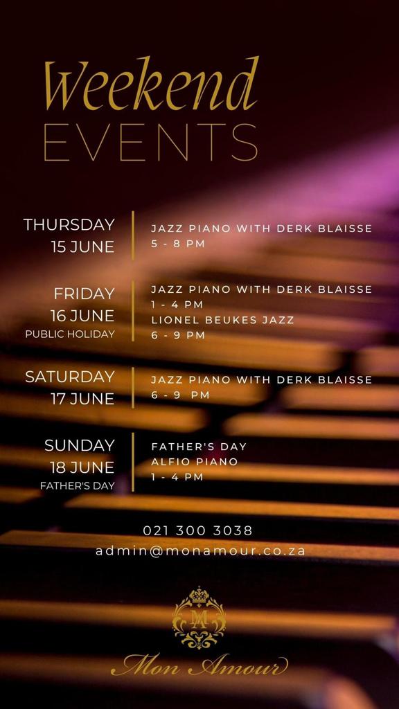 - Contact Mon Amour Franschhoek at 021 300 3038 or email admin@monamour.co.za to reserve your spot and guarantee an extraordinary weekend of elegance, music, and delectable cuisine.