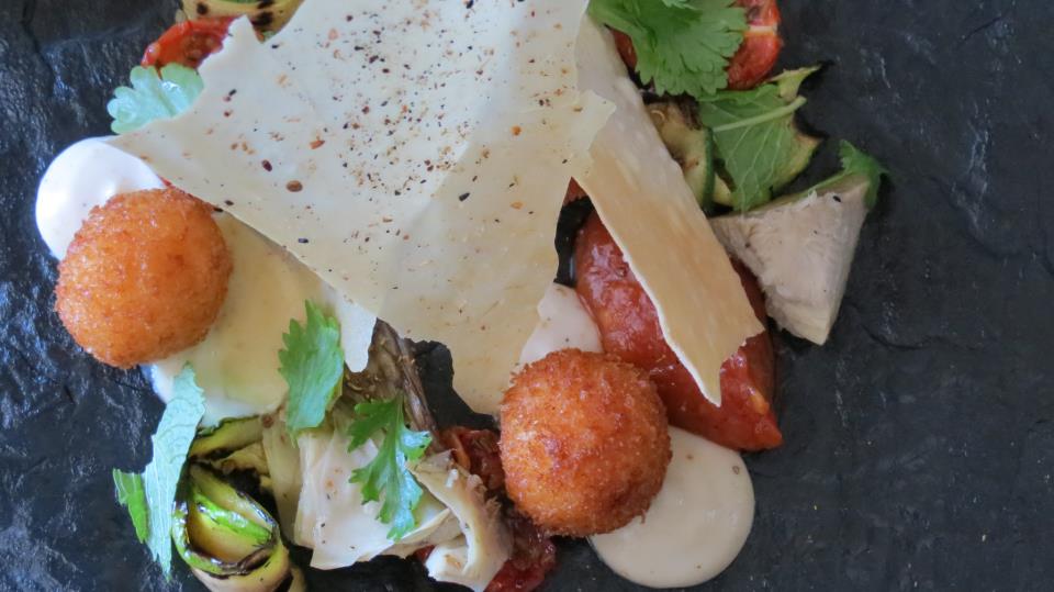 Cheese croquettes, harissa, babaganoush, yogurt, Mediterranean vegetables