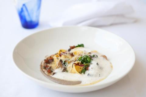 Gnocchi, tomato, mushrooms, smoked aubergine puree, olives, persillade