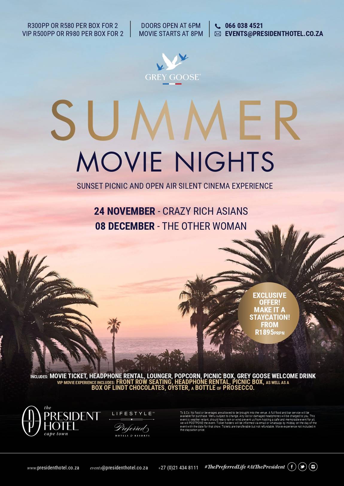 Tickets are R300 per person and includes headphone rental, lounger, popcorn, a picnic box, a Grey Goose welcome drink.