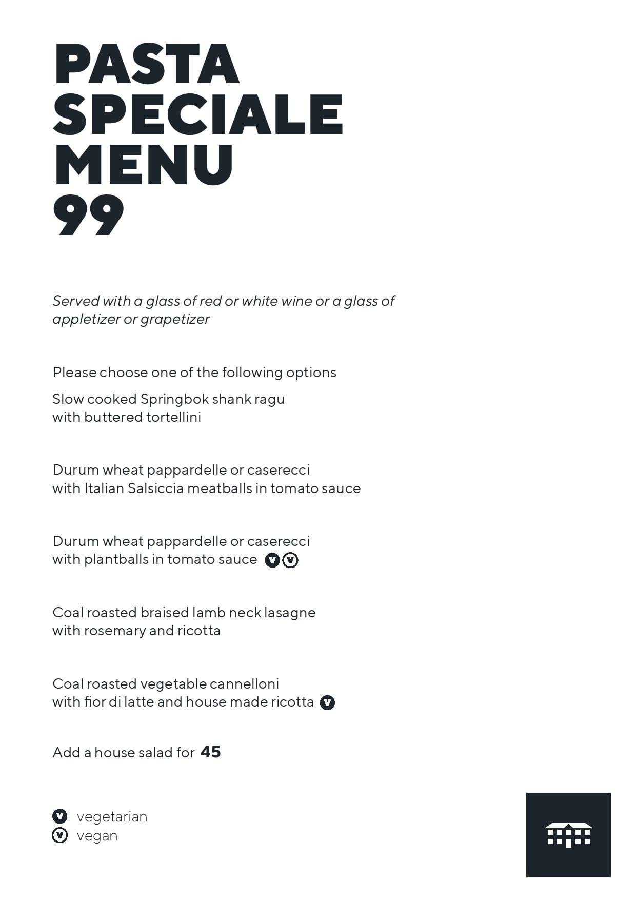 Pasta and a glass of wine for only R 99.