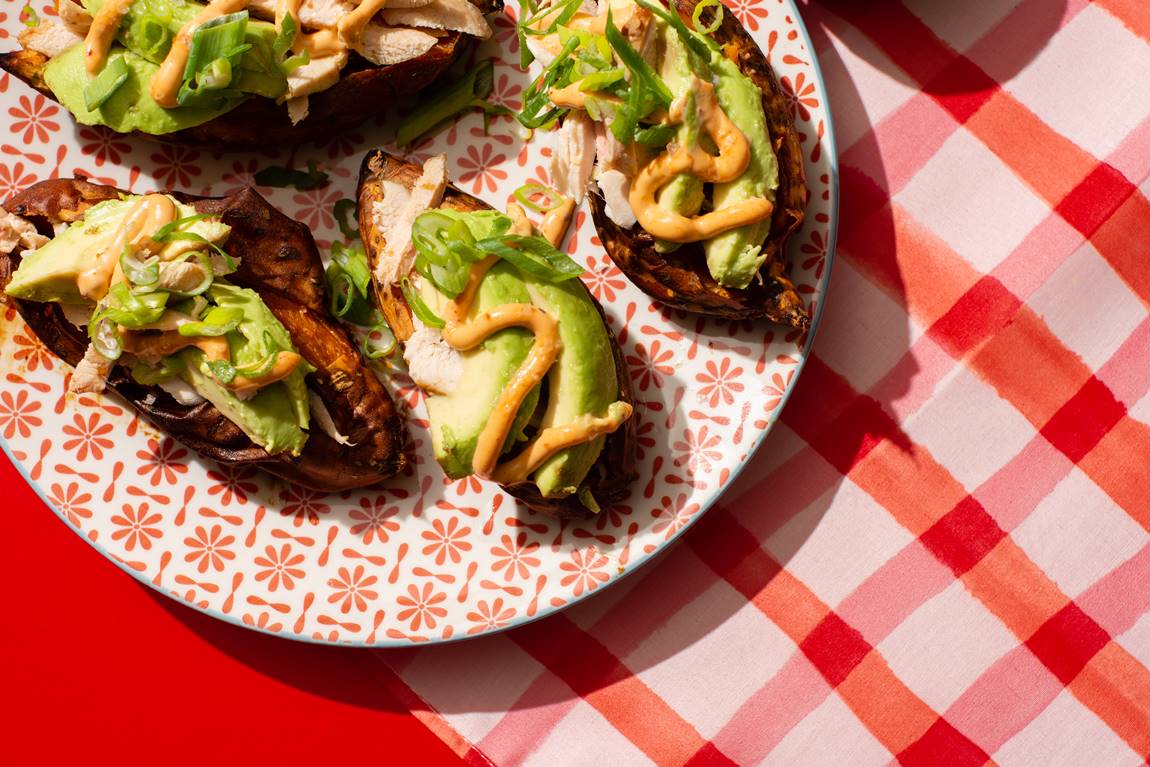 Air Fryer Sweet Potato Boats with Rotisserie Chicken and Avocado