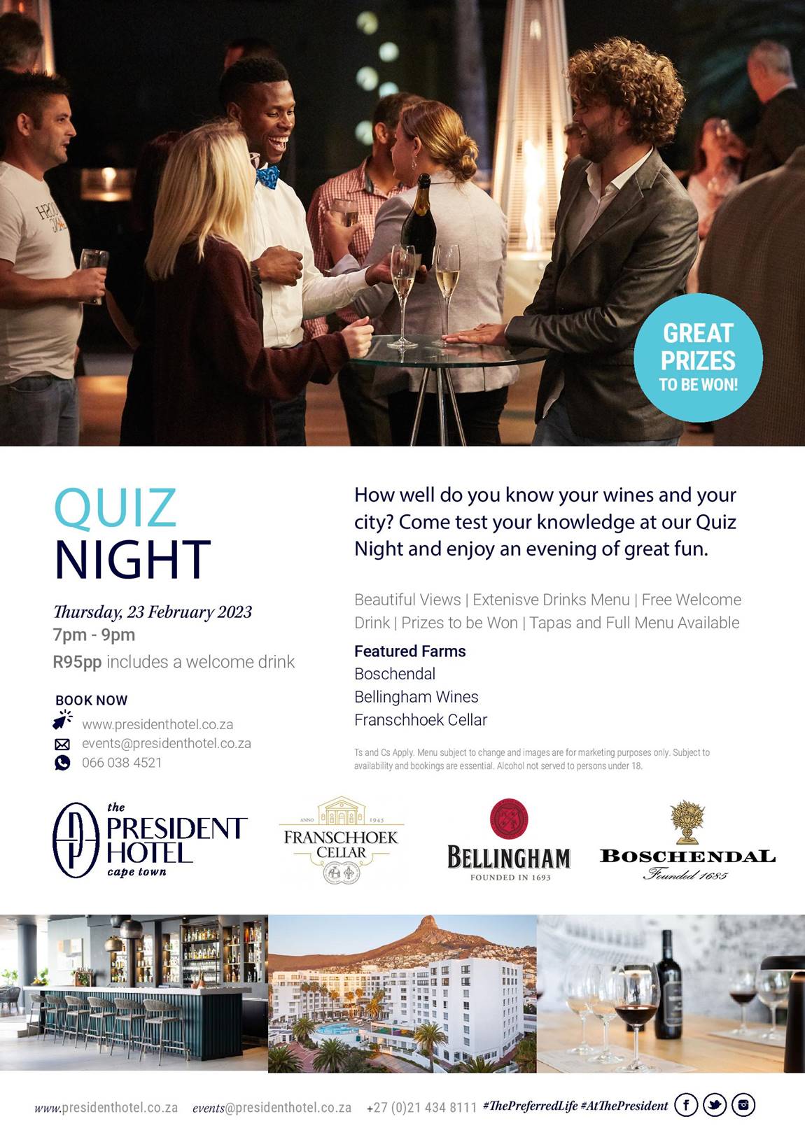 The President offers beautiful views of Cape Town, making it the perfect location for this Quiz Night. So, gather your friends, put on your thinking cap, and come enjoy a night of laughter, great food, and drinks.