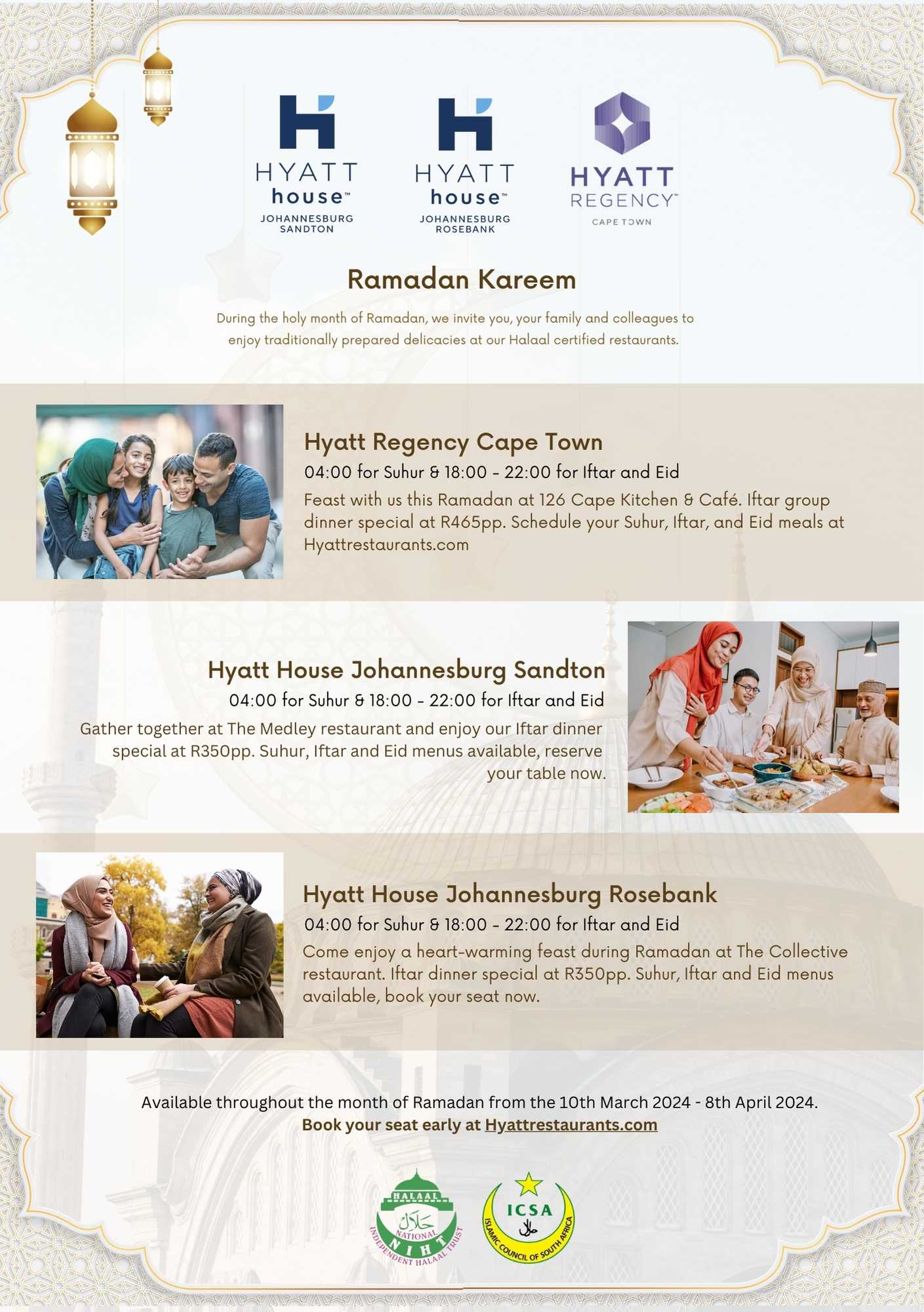 Guests can conveniently schedule their Suhur, Iftar, and Eid meals at Hyatt restaurants, ensuring a hassle-free and enjoyable celebration during this special time of the year. Click here to make a reservation now!