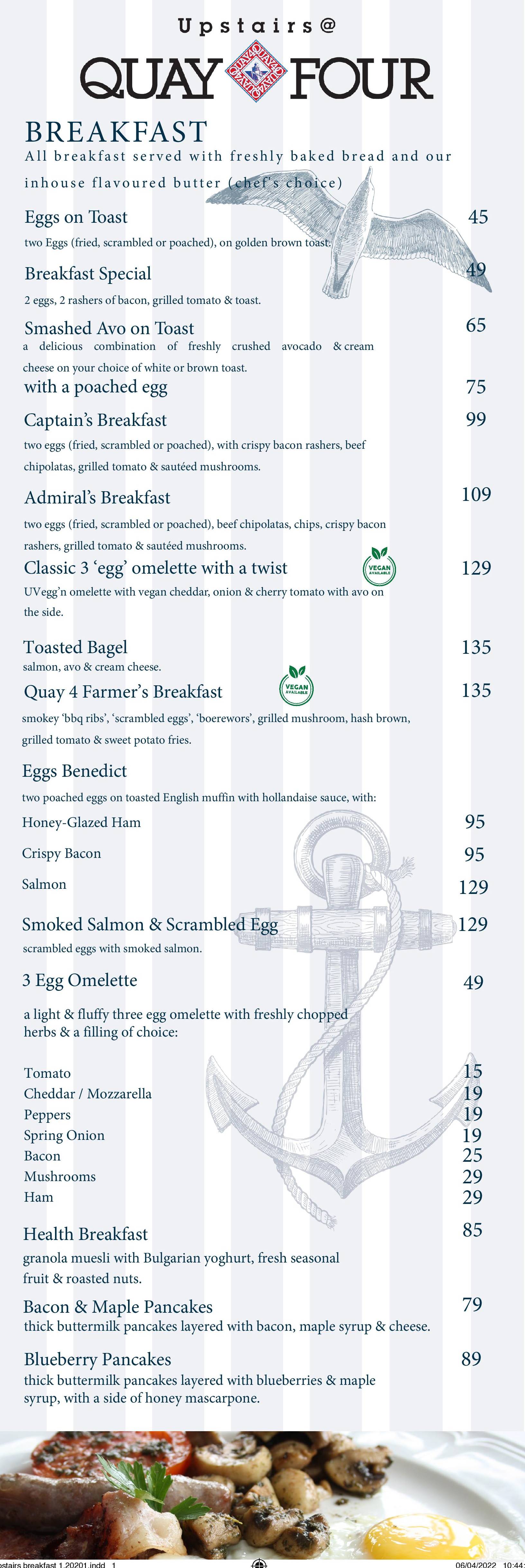 There’s no better way to kick off the day than with a satisfying breakfast by the water, and Upstairs at Quay 4 is serving up just that with their unbeatable breakfast special for only R49.