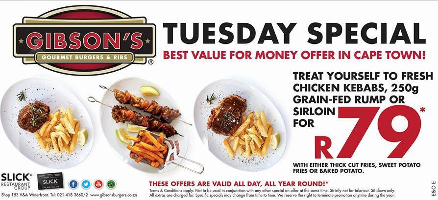 Gibsons Gourmet Burgers have a new Tuesday promotion! Receive a 250g 28 day matured grain fed sirloin or rump, or a grilled chicken skewer, with a choice of thick cut fries, sweet potato fries or a baked potato, for an unbelievable R79. These are strictly for sit-down meals only with no take-aways allowed. Now that’s value for […] More
