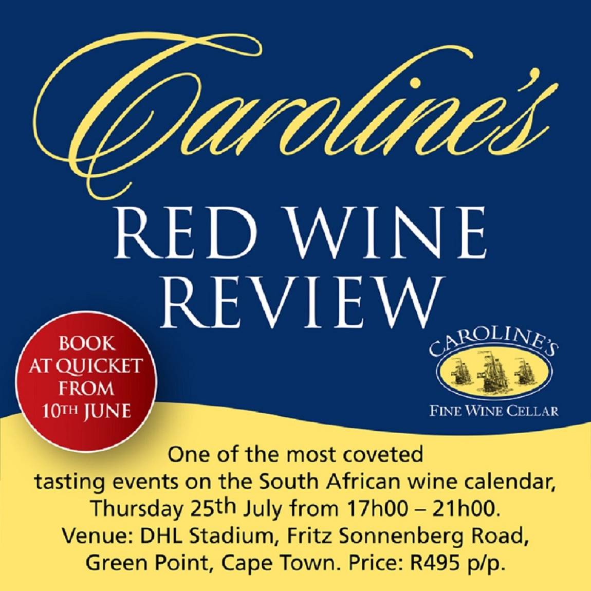 Join Caroline and her team in the Members’ Lounge at the DHL Stadium outside Cape Town’s V&A Waterfront from 17h00 to 21h00. At the entrance, you will be given a crystal tasting glass and a detailed list of what’s available for tasting. Attendees will be able to place orders to purchase from the list at a 15% discount relative to the usual retail pricing.