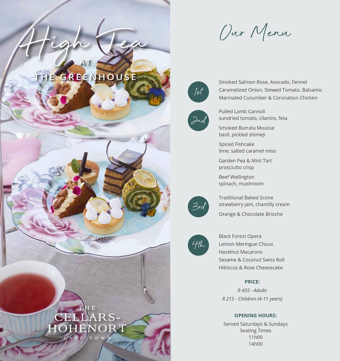 Served Saturday to Sunday 11h00 to 13h00 & 14h00 to 16h00. R495 for Adults, R215 for Children (4 – 11 years).