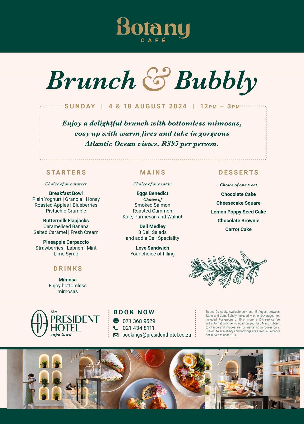 Bookings can be made via WhatsApp at 071 368 9529 or email bookings@presidenthotel.co.za. For more information, visit www.presidenthotel.co.za
