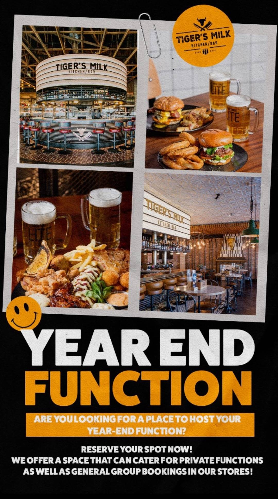 Don’t wait any longer! The clock is ticking, and the year-end festivities are just around the corner. Secure your spot at Tiger’s Milk now to guarantee an unforgettable year-end function. With an extensive menu of mouthwatering dishes and a well-stocked bar featuring a wide array of beverages, your guests are in for a treat.