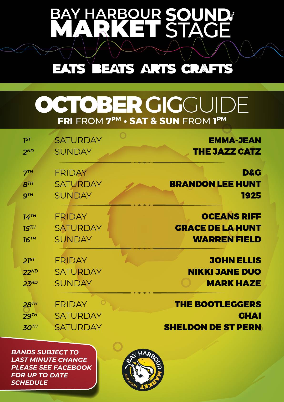 Emma-Jean is known for her crystal-clear highs and beautiful voice that can sing anything from classic to pop. Dani Ville is a skilled guitarist, ukulele and harmonica player who can teach us a thing or two. Warren Field captures the audience with his classic tunes appropriate for any occasion. John Ellis is a talented singer and songwriter and lastly, The Bootleggers a blues band with decades of experience between them. Yet, these are just some of the amazing musicians that will join the sound stage at Bay Harbour Market this October.