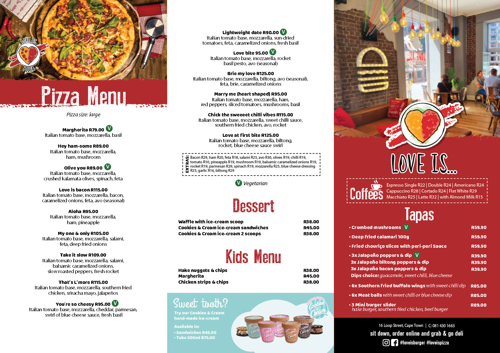 Collection for your pizza [menu] or burger [menu] orders will be at their new Loop Street restaurant.
