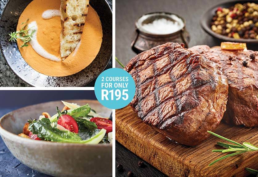 Once you’ve done that, then you can take advantage of this delicious deal. For the whole month of August, you can enjoy a 2-course meal for only R195. Warming soup for starters, followed by a juicy 200g sirloin steak with chips AND a Caesar salad. How can you not?