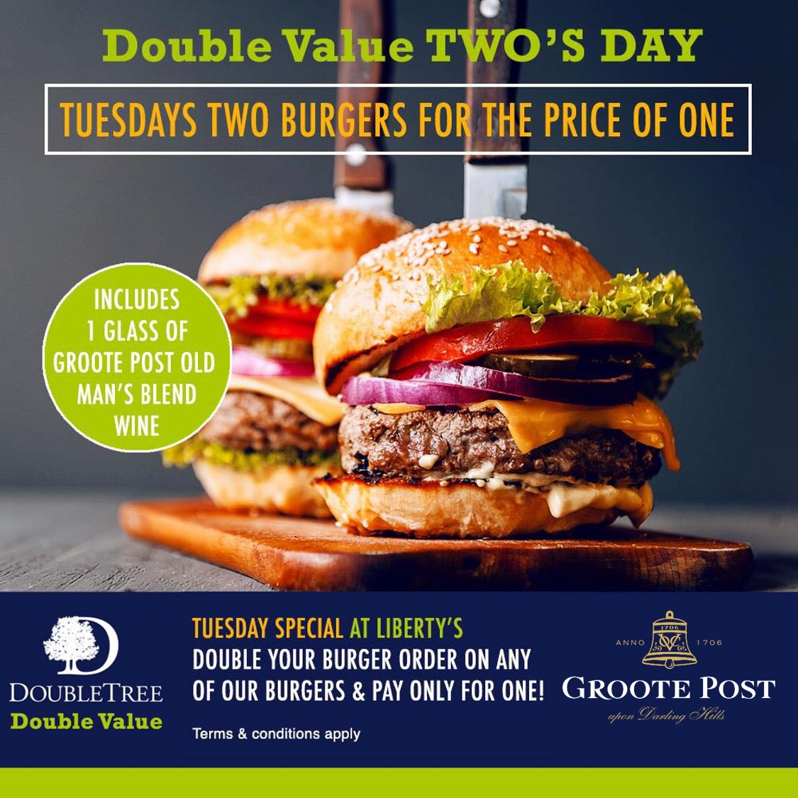 Enjoy two burgers for the price of one every Tuesday. This also includes one glass of Groote Post Old Man’s Blend Wine.