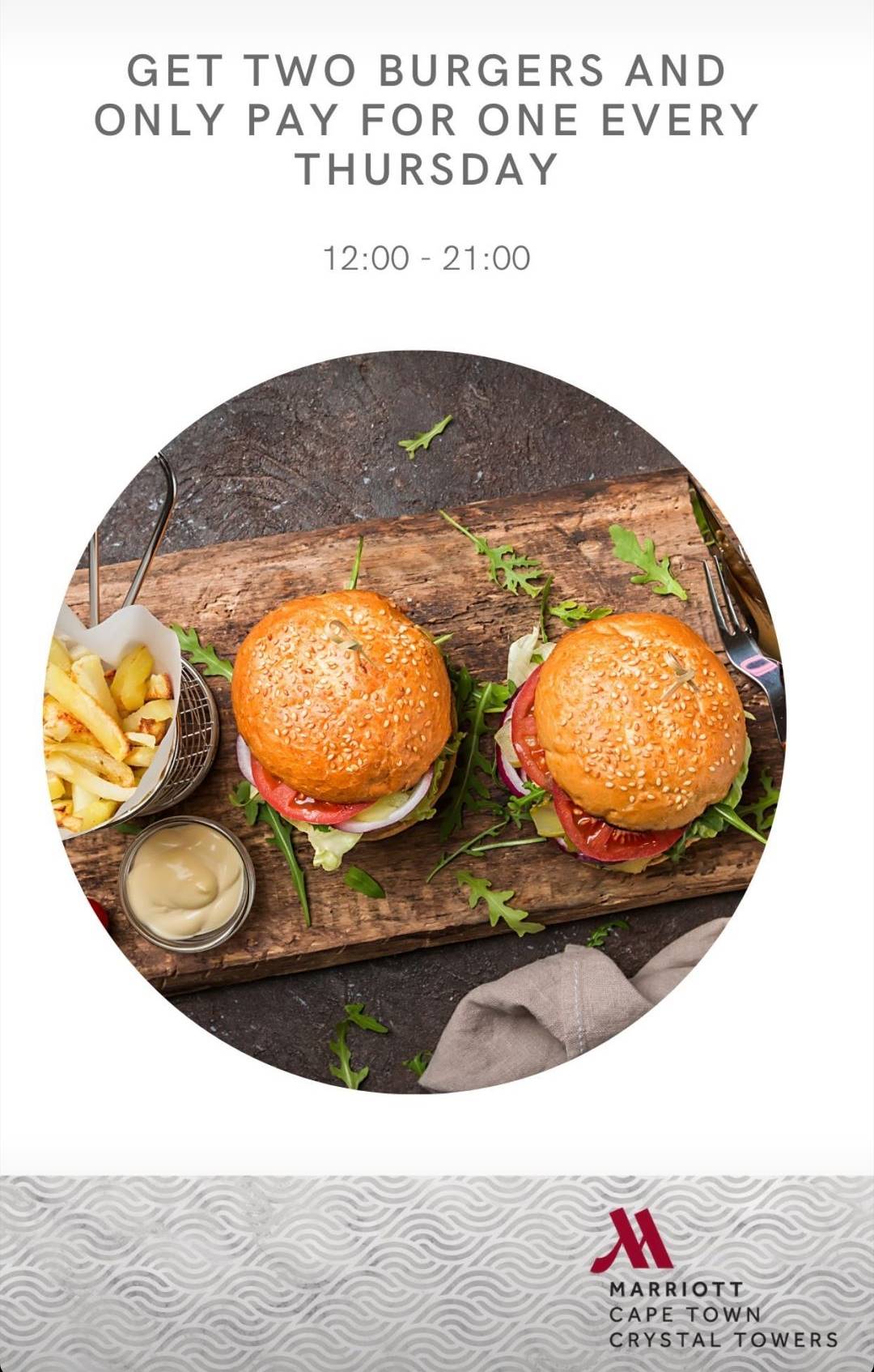 Whether you choose to come for lunch or dinner, order two burgers and only pay for one every Thursday at Crystal Towers. This special is available from 12:00-21:00.