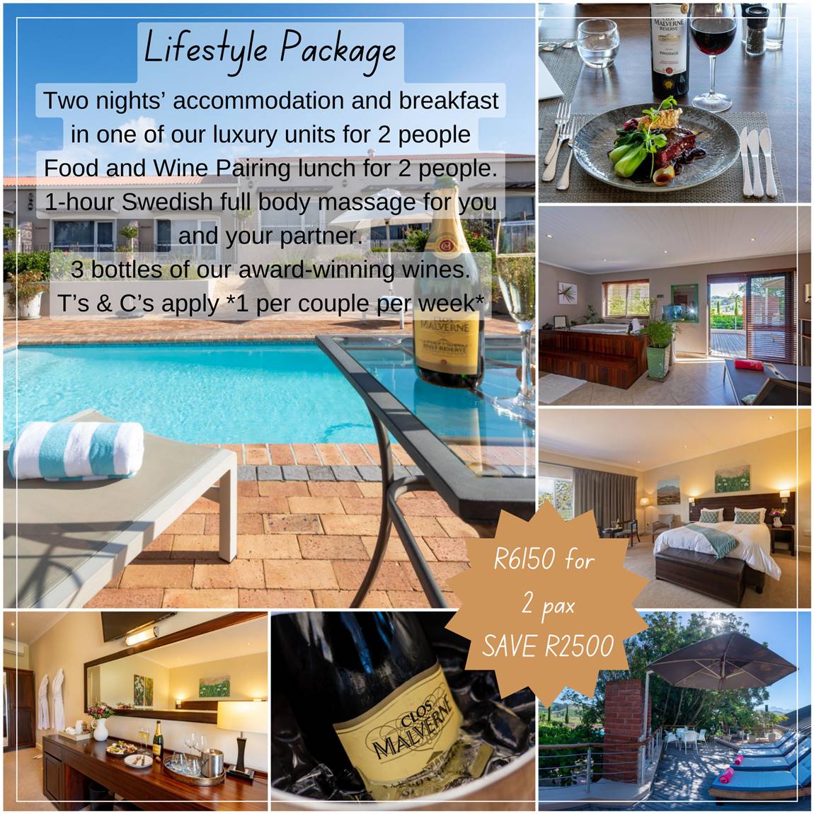 The second gift idea is the Lifestyle Package, which includes two nights’ accommodation and breakfast in one of Clos Malverne’s luxury units, a food and wine pairing lunch for two, a one-hour Swedish full body massage for you and your partner, and three bottles of Clos Malverne’s award-winning wines. This package is priced at R6 150.00 for two people, making it an incredible value for a romantic getaway in the stunning Cape Winelands.
