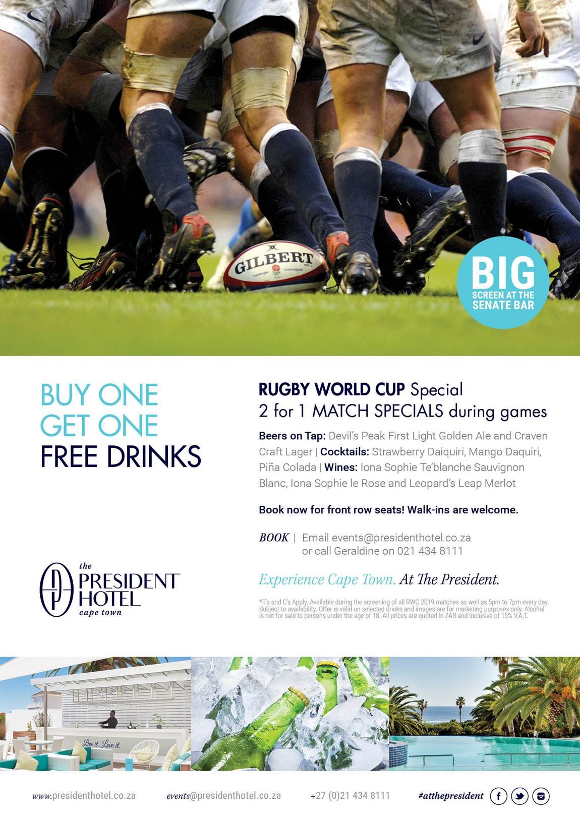 The Senate Bar at the President Hotel is offering two for one drinks during the Rugby World Cup matches, so bring your enthusiasm and your friends here to cheer the Bokke on. Special applies during matches only.