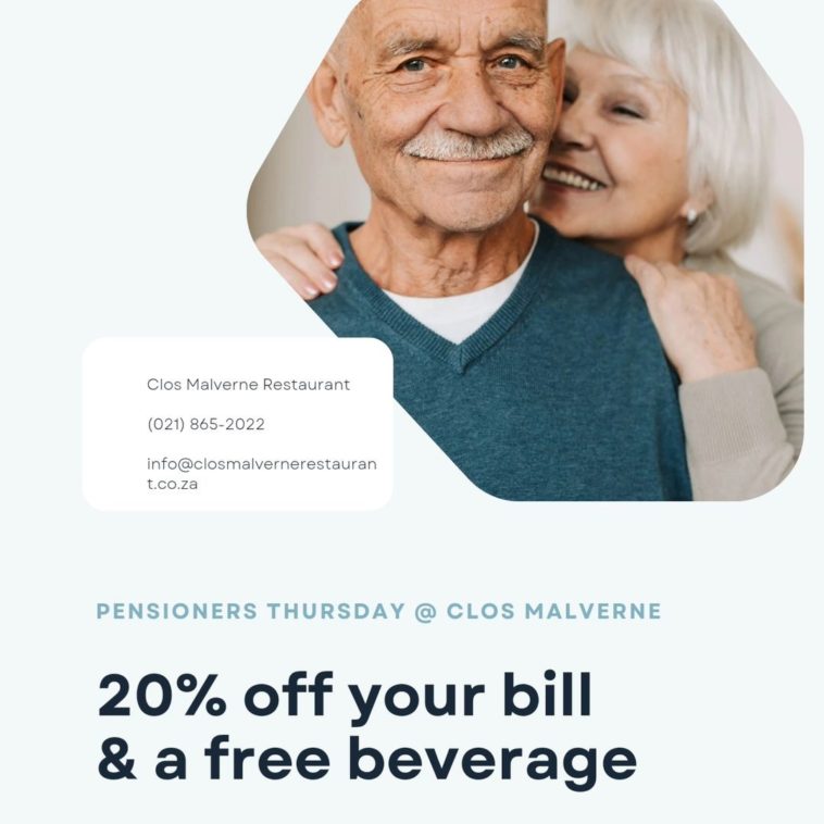 Clos Malverne is delighted to offer pensioners an exclusive discount of 20% off their bill, accompanied by a complimentary beverage of their choice.