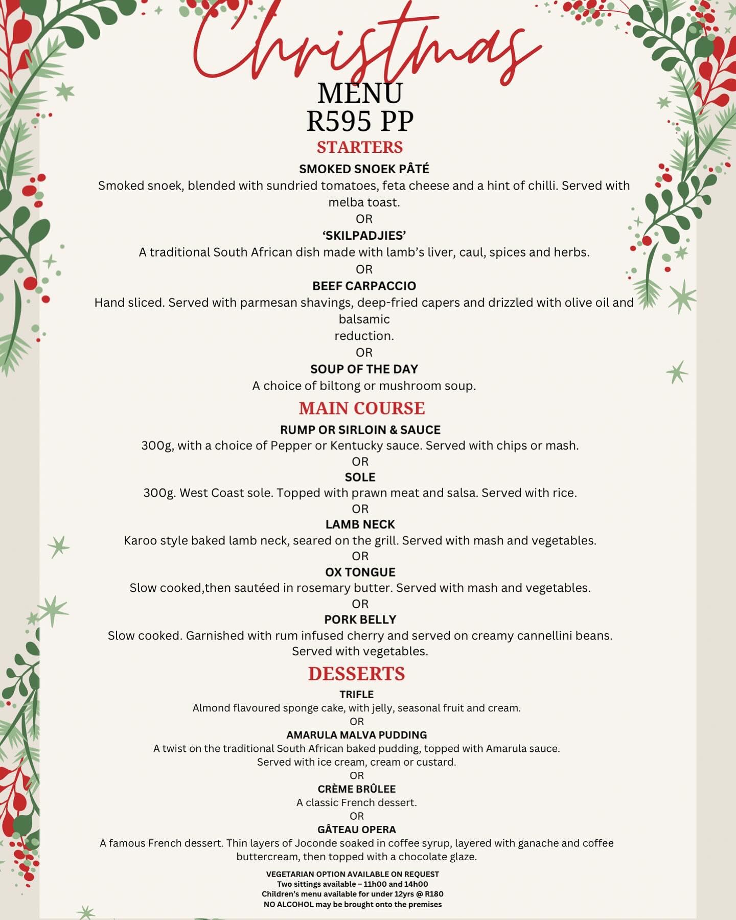 Vegetarian options are available upon request, and a children’s menu is offered for R180. Secure your booking early by emailing info@bens.co.za and make this Christmas at Ben’s one to remember.