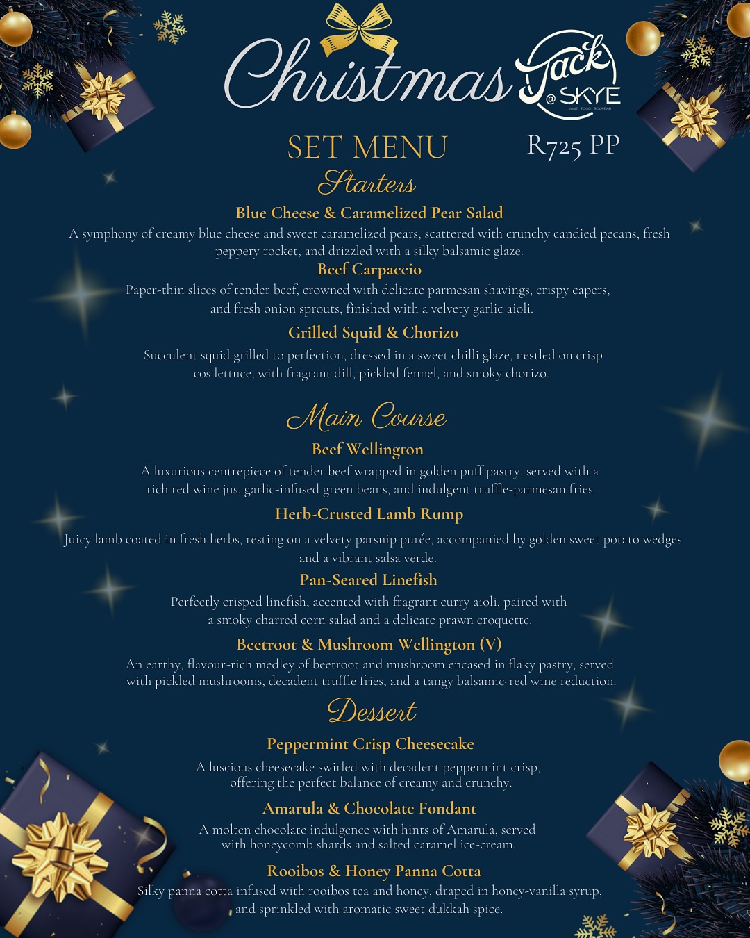And because no Christmas is complete without something sweet, diners can finish with one of three decadent desserts: the nostalgic Peppermint Crisp Cheesecake, the indulgent Amarula & Chocolate Fondant, or the silky Rooibos & Honey Panna Cotta—each one a festive finale in its own right.