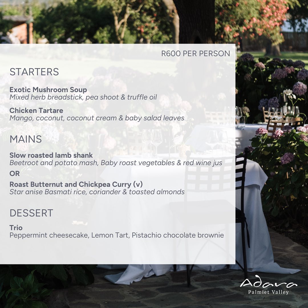 Secure your table now to ensure an unforgettable dining experience for the special woman in your life. For reservations, simply email restaurant@adara-palmiet-valley.co.za.